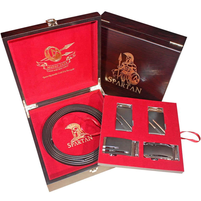 Úvod » KOŽENÉ OPASKY » Prémiová luxusní dvoupatrová sada Opasků Spartan v dřevěné kazetě. BOX č.S4